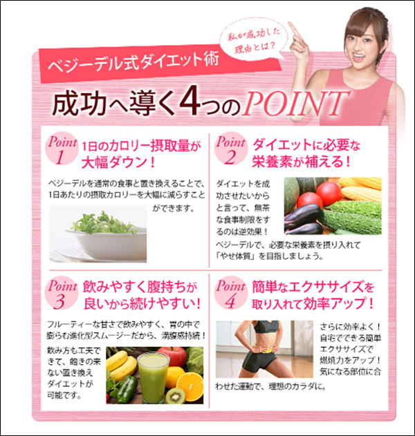 172種類もの野菜・果物の酵素と豊富な食物繊維を含むサイリウム・グルコマンナンなど、美容と健康にいい成分が多く含まれた「ベジーデル酵素スムージー」。現在、食事の一部をこの製品に置き換えて摂取するカロリー等を抑える「置き換えダイエット」が話題になっています。その一方、ベジーデル酵素スムージーでダイエットするためには何点か注意点があります。